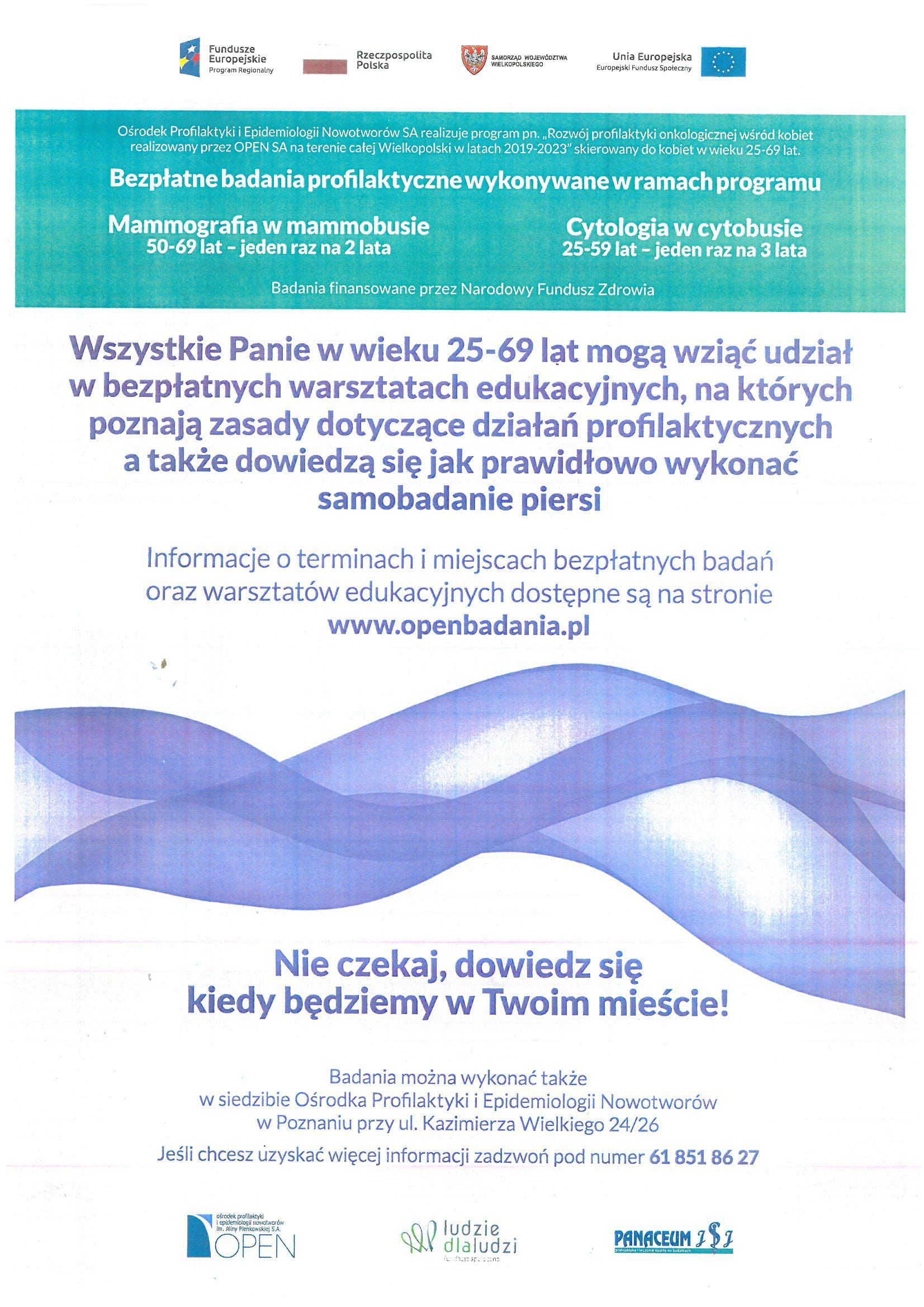 Bezpłatne badania mammograficzne dla kobiet w wieku 50-69 lat odbędą się w dniu 21.07.2020 r. w godz. 13 - 17. Zarejestruj się już dziś!