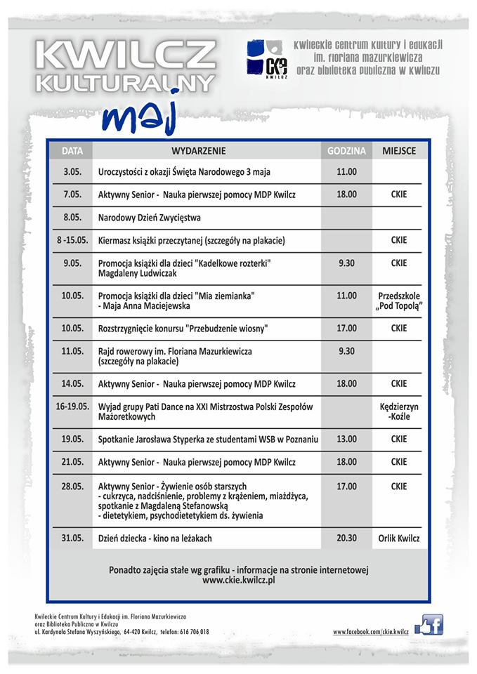Zapraszamy do zapoznania się z ofertą przygotowaną przez Centrum Kultury i Edukacji oraz Bibliotekę Publiczną na miesiąc maj.